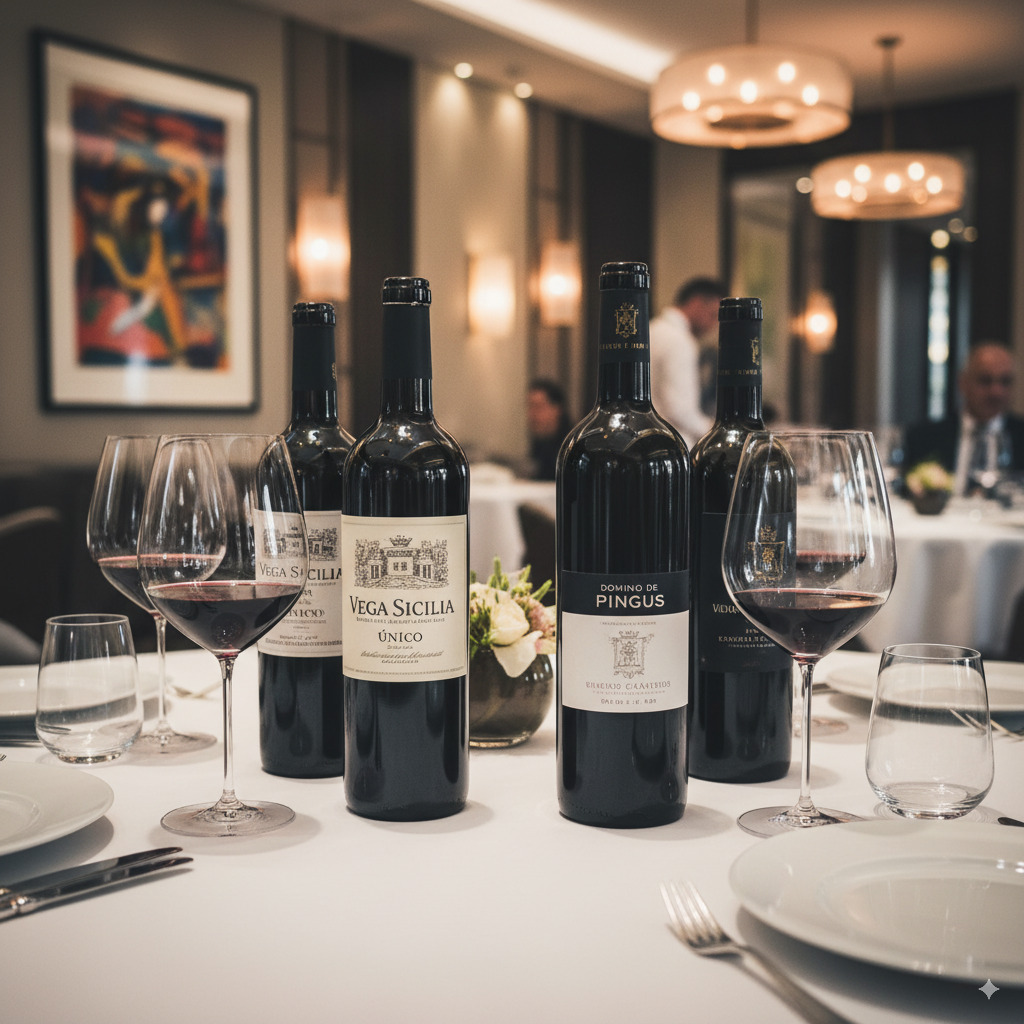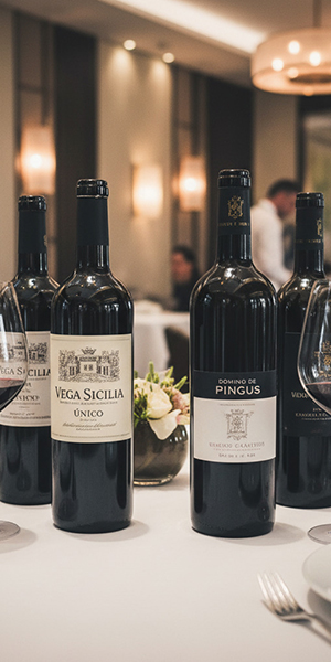 Nuestra selección de vinos es una celebración del terroir, la tradición y la innovación. Desde tintos emblemáticos como Vega Sicilia Único o Dominio de Pingus, hasta blancos frescos como Pazo Señorans Albariño o Belondrade y Lurton, cada botella ha sido elegida por su capacidad de emocionar.