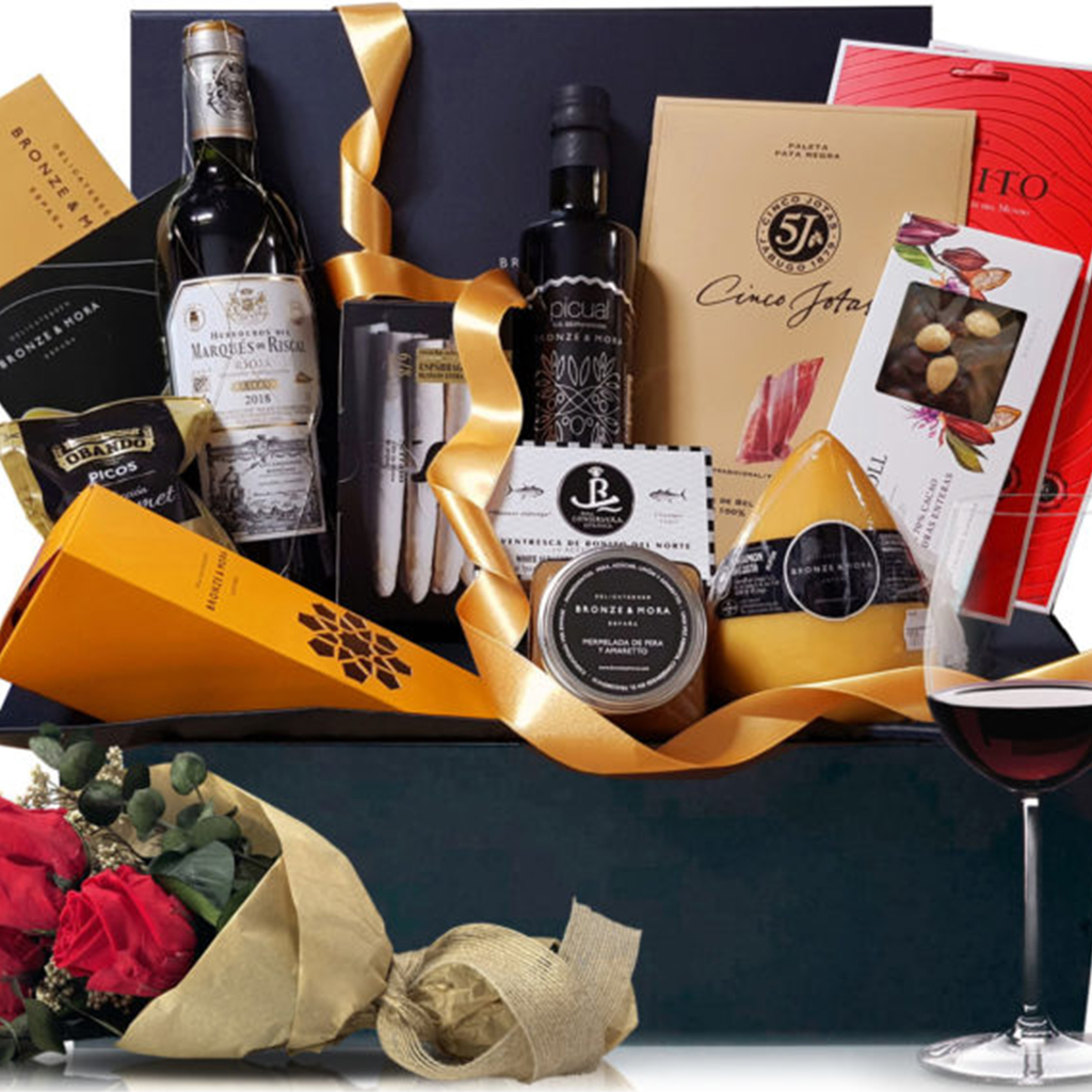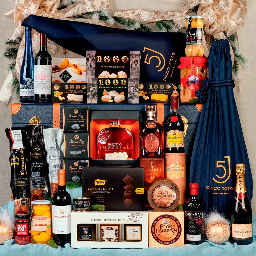 Desde baúles con vinos y ibéricos, hasta cajas temáticas con dulces, quesos y destilados, cada presentación combina estética, calidad y emoción.